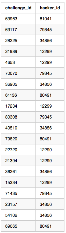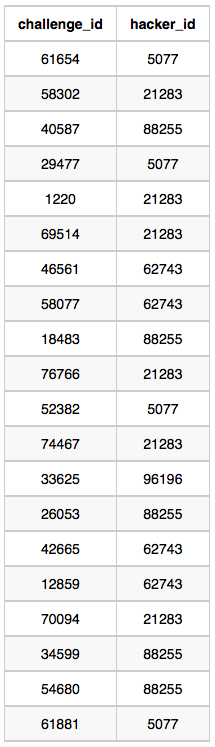 Challenges: The challenge_id is the id of the challenge, and hacker_id is the id of the student who created the challenge.