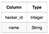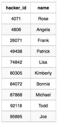Hackers: The hacker_id is the id of the hacker, and name is the name of the hacker.