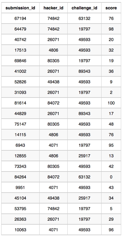 Submissions: The submission_id is the id of the submission, hacker_id is the id of the hacker who made the submission, challenge_id is the id of the challenge for which the submission belongs to, and score is the score of the submission.